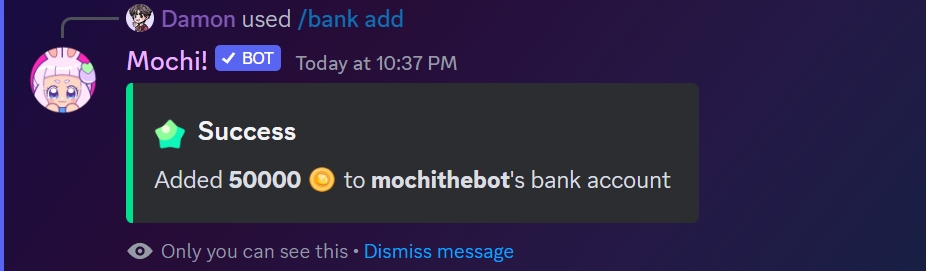 Once the currency has been added to the user's bank balance, you will receive a confirmation: