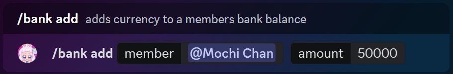 A member's bank account balance can be increased by using the /bank add