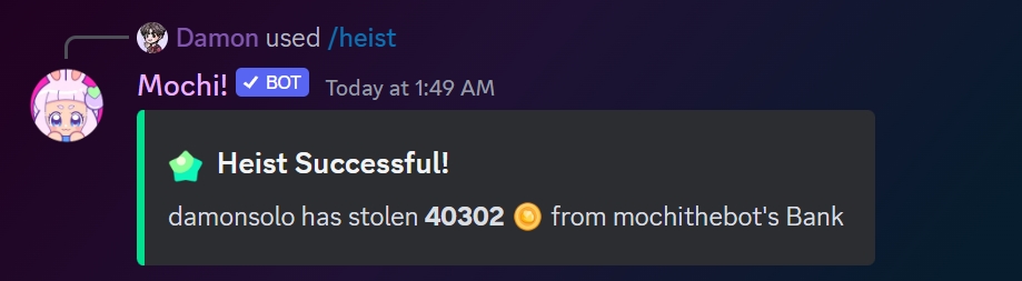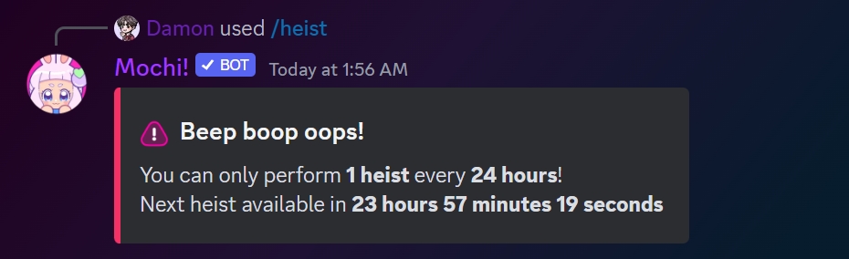 There is a 24-hour cooldown for the heist command.