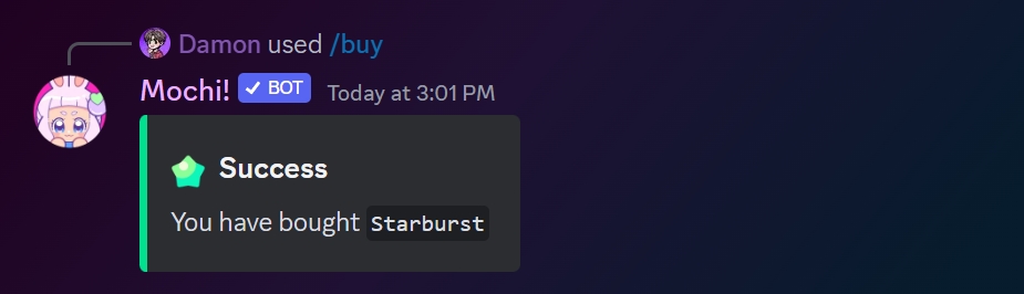 To buy an item from the store, simply use the /buy command followed by the item name. For instance, let's take the "Starburst" role as an example.