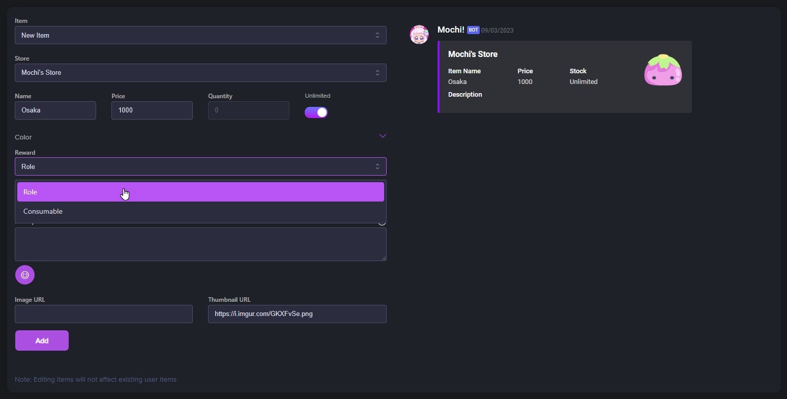 The store items are awesome things that you can get from your server's store. Mochi is currently able to offer you different types of store items, which are: