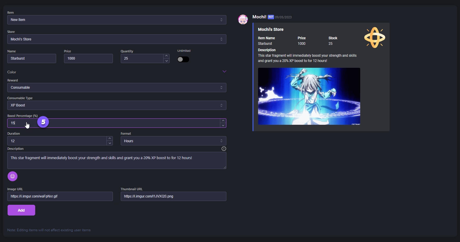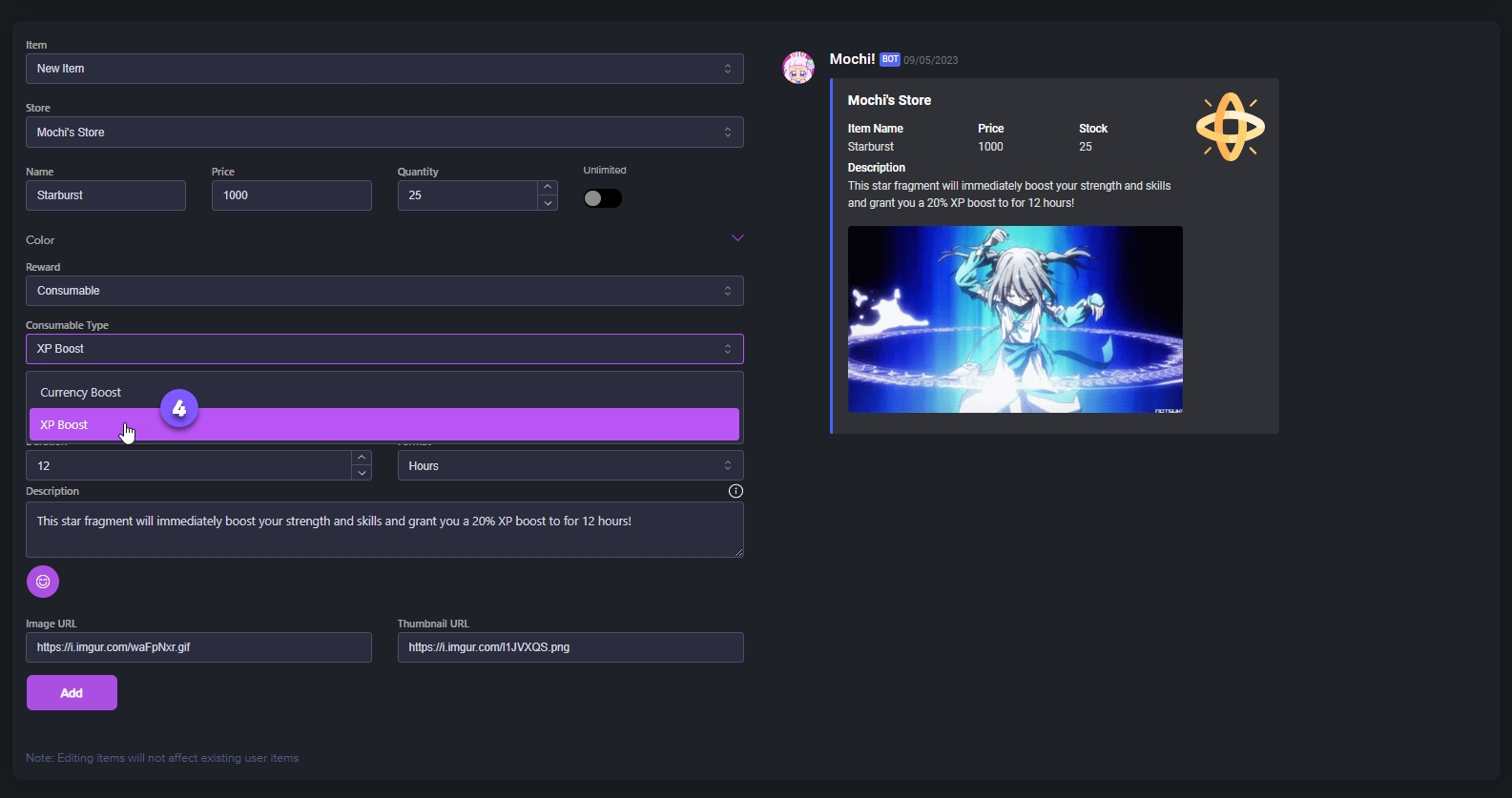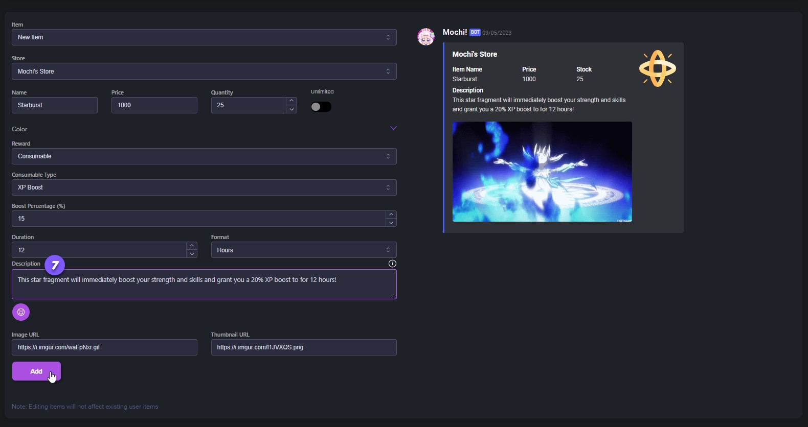 To make your item even more unique, craft a wonderful description and add a thumbnail image and a main image. Once everything looks good, simply click "Add" and your brand new XP Boost item will be good to go!