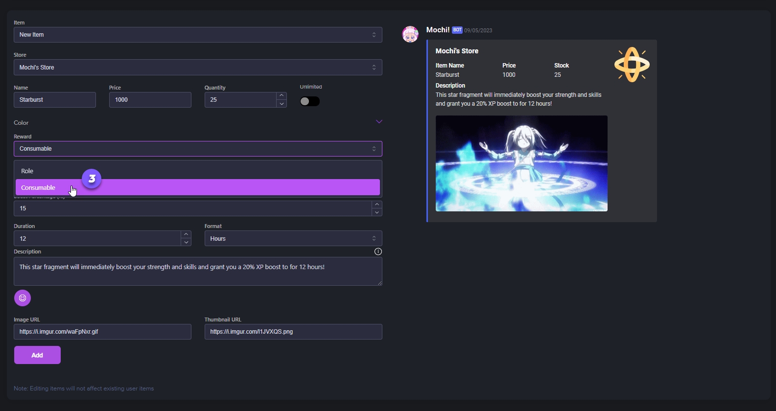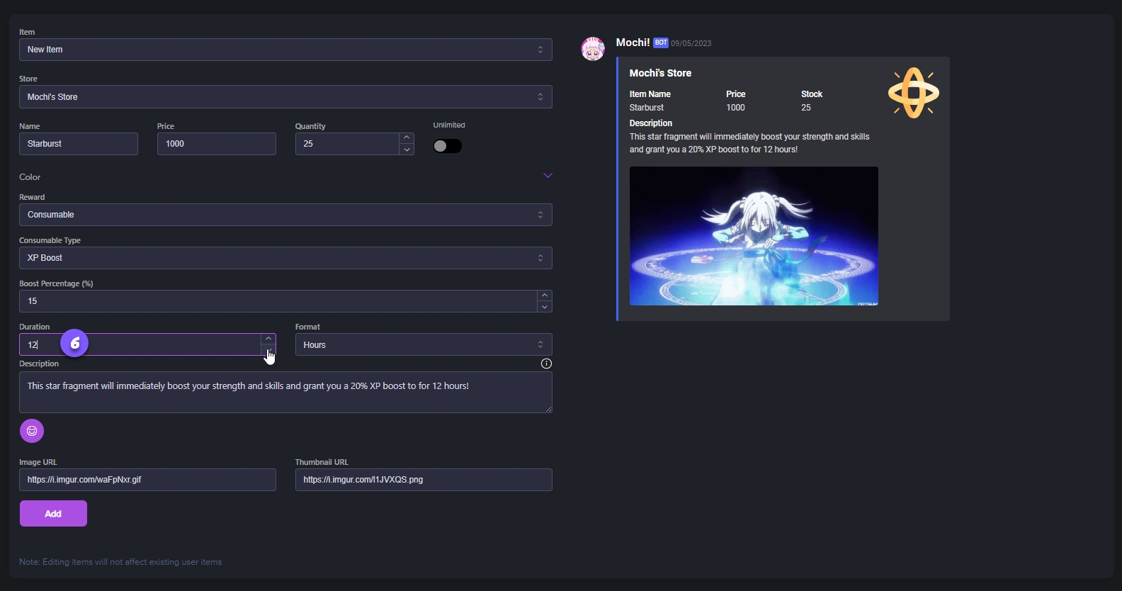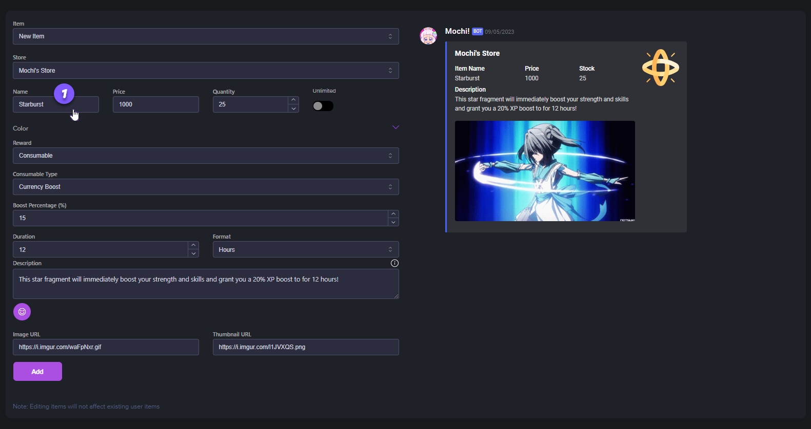 To make your item even more unique, craft a wonderful description and add a thumbnail image and a main image. Once everything looks good, simply click "Add" and your brand new XP Boost item will be good to go!