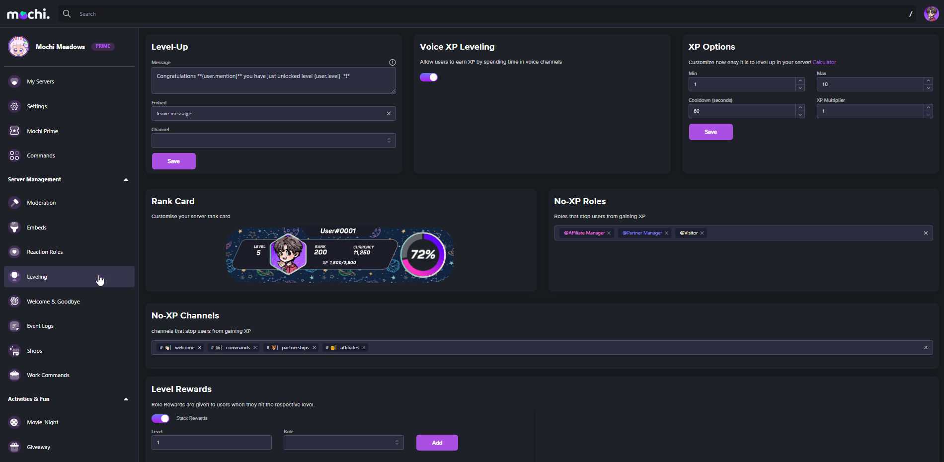 With Mochi, you can easily manage XP commands and customize level rewards with an intuitive interface on the Mochi Dashboard. It's perfect for matching the pace of your server, so everyone can have fun leveling up together!
