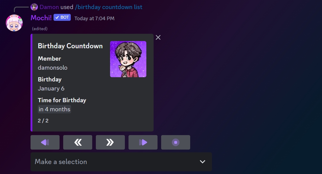 After running the command, a list of birthdays scheduled on the server will be presented along with a countdown for each member's birthday.