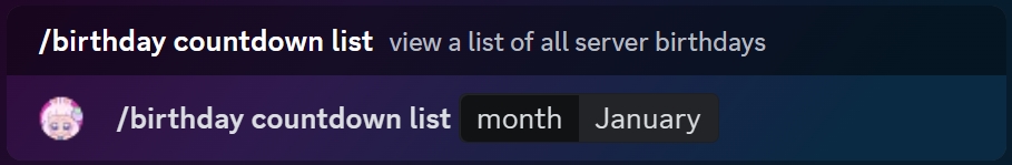 Use the /birthday countdown list command to see a countdown of server members with upcoming birthdays.