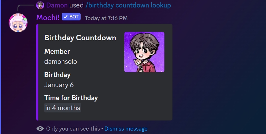 After using the command, the member's birthday will be displayed along with a countdown to the day.