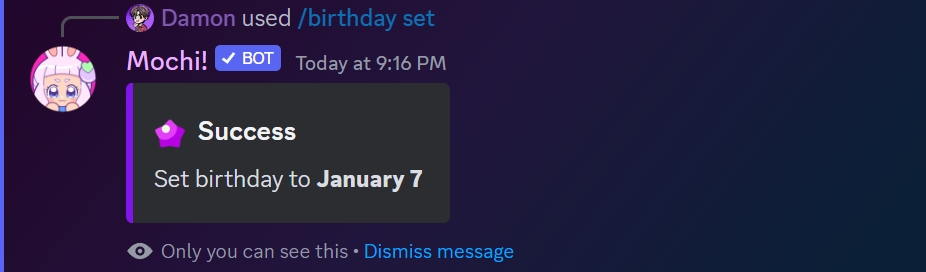 Setting your birthday in any server where Mochi is present is easy with the /birthday set command. Here's what you need to do: