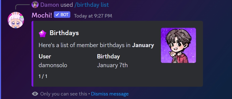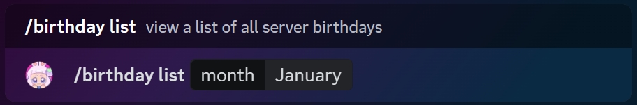 After executing the command, a comprehensive list of birthdays configured in the server will be displayed.