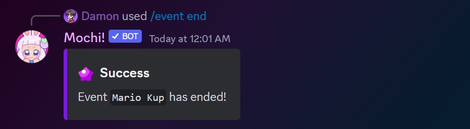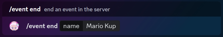 command. This removes the event from Discord's events section. Select the correct event from the autocomplete field.