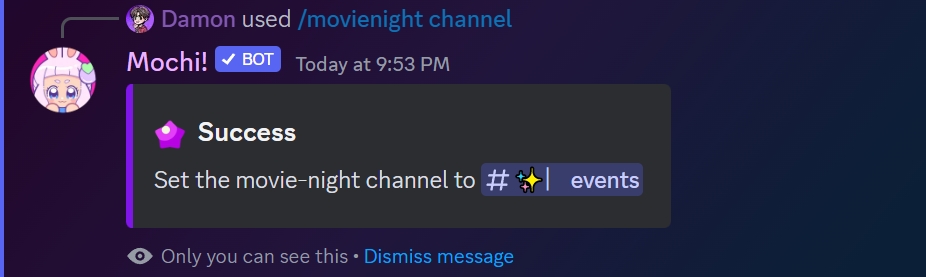 Once you have successfully turned on the movie night announcement channel, you will receive the following response:
