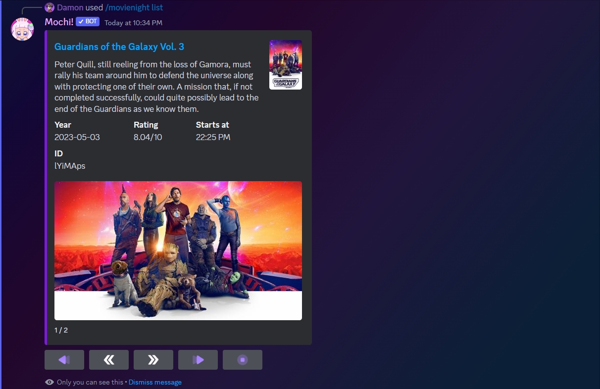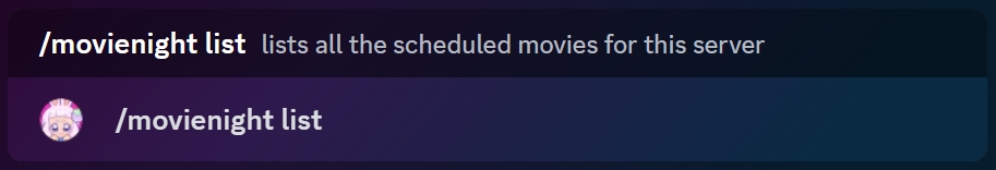If you want to find out which movie nights are happening in your server, just type in the command /movienight list