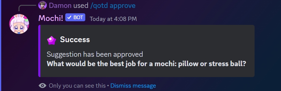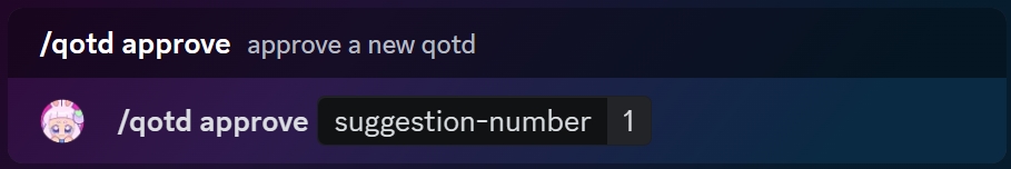 For instance, if you would like to approve the first question in the queue, use the command /qotd approve followed by the suggestion number.