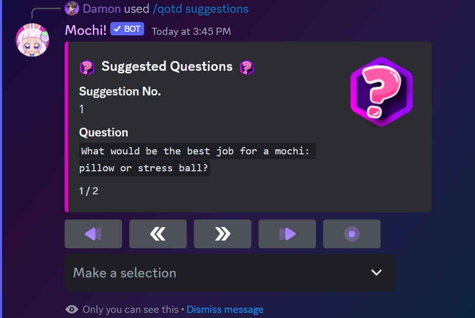 Once you enter the command, you'll see a page that shows you a bunch of suggested questions of the day (QOTDs) that you can browse through.