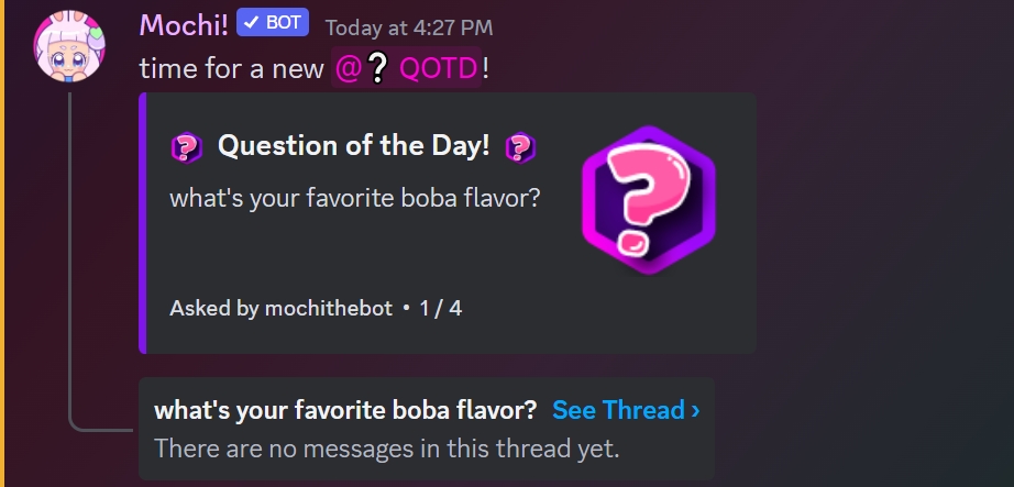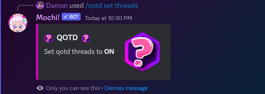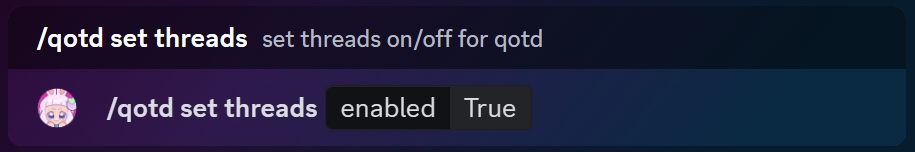 You can enable the daily question of the day as a thread in your QOTD channel by using the /qotd set threads command and selecting "True" for your server.