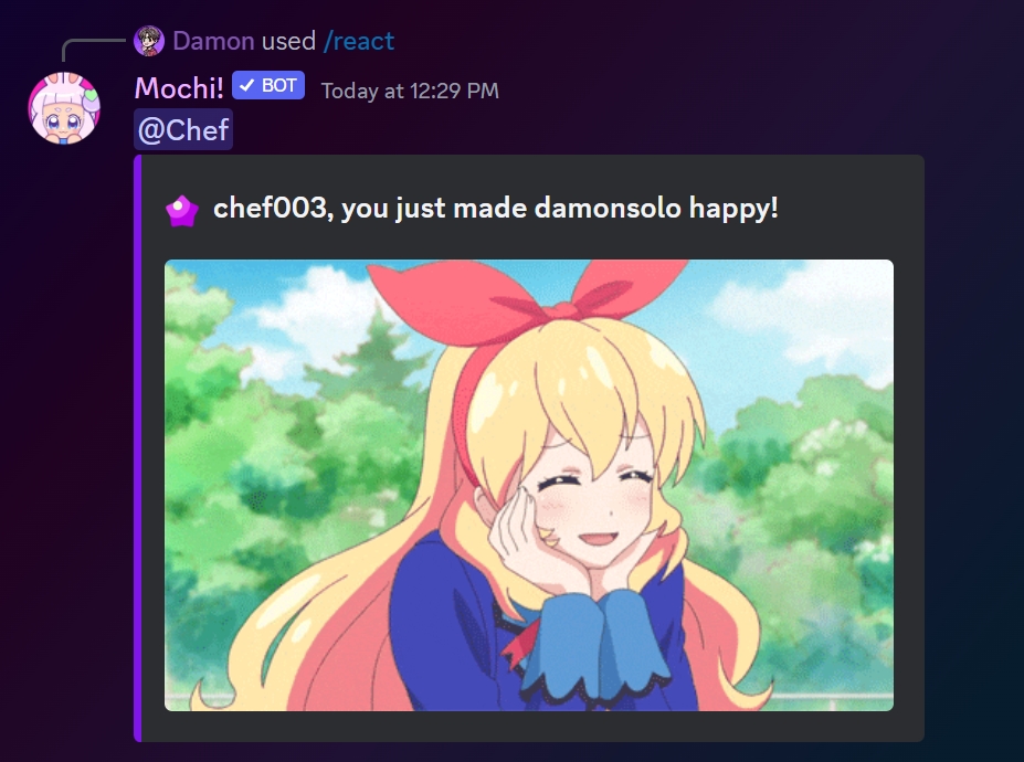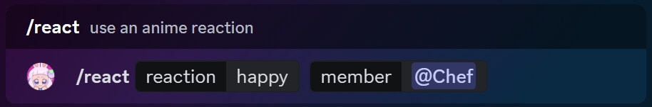 When you want to share your reactions with a friend, just use the /react command, choose your favorite reaction, and tag your friend! And that's it! You'll get a cool and random anime gif to enjoy together!