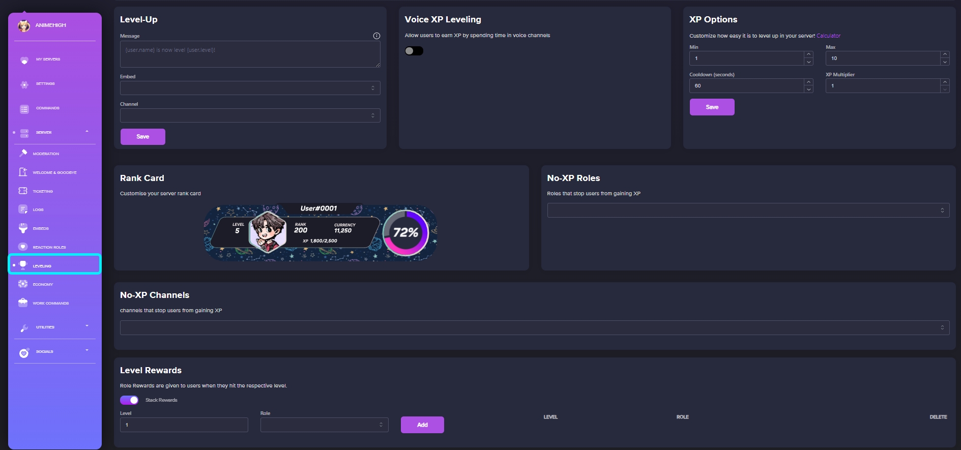 The dashboard's user-friendly design allows you to easily create level-up messages, turn on voice XP leveling, customize the leveling difficulty, design unique rank cards, assign roles and channels without XP gain, and most importantly, establish level rewards for your server.