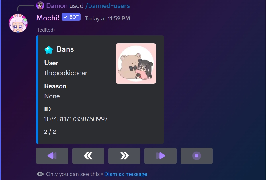 After using the command, you'll see a list of banned members. You can easily navigate through the list using the buttons provided.