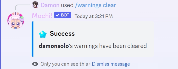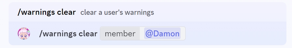 To clear warnings issued against a member in the server, use the /warnings clear