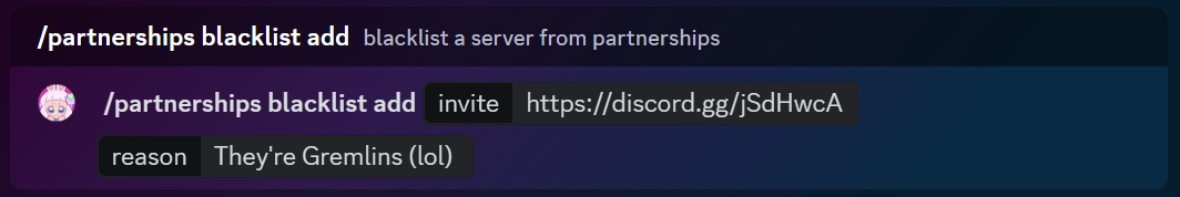 If you need to blacklist a server from partnerships, just type in the command /partnerships blacklist
