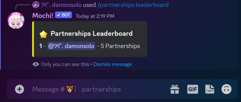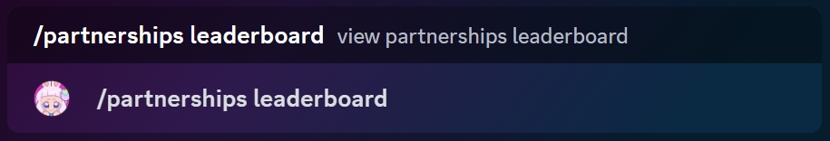 If you want to check out the leaderboard for Partnership Managers, just type in the /partnerships leaderboard