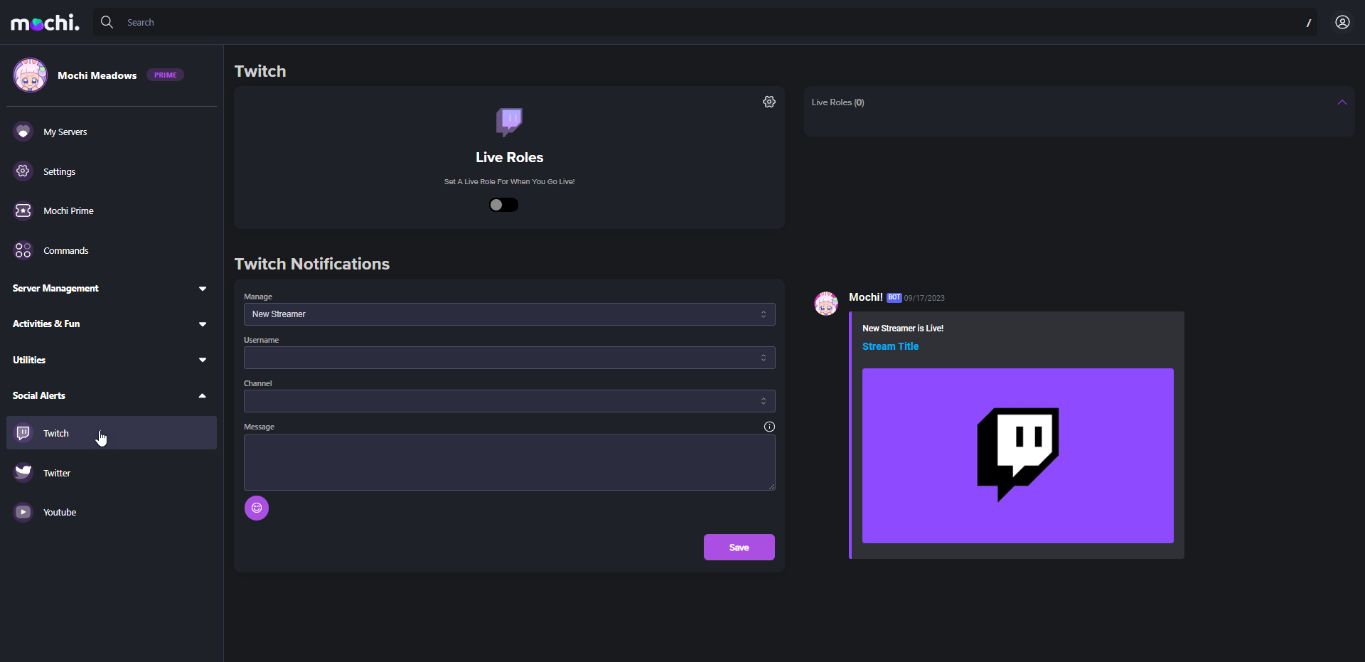 With Mochi's Twitch Notifications module, you can easily let your community know when you or your favorite Twitch streamers go live! This module has two cool components: Twitch Notifications and Live Roles.