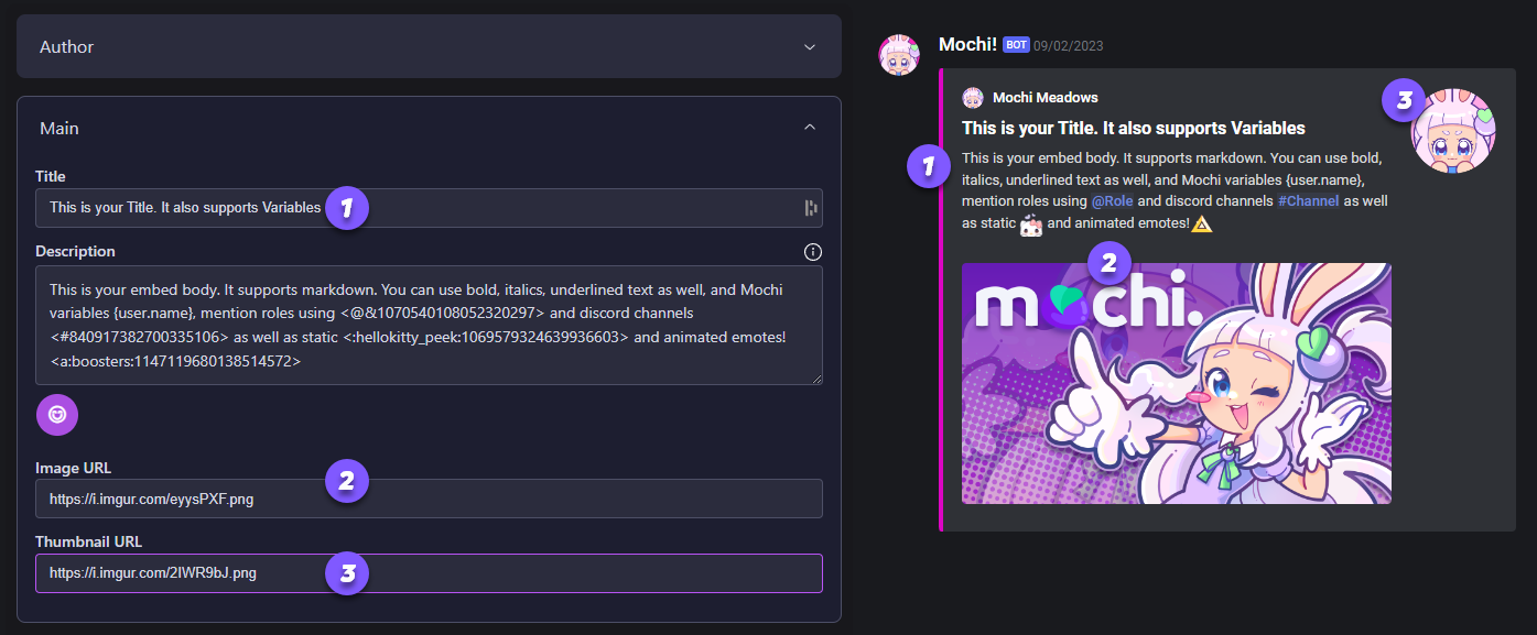 Did you know that you can add an awesome avatar or GIF as a thumbnail image in your embeds? This is done by using the thumbnail URL field, which is super easy to use. Plus, you can even display Members' profiles and server icons using variables. Cool, right?