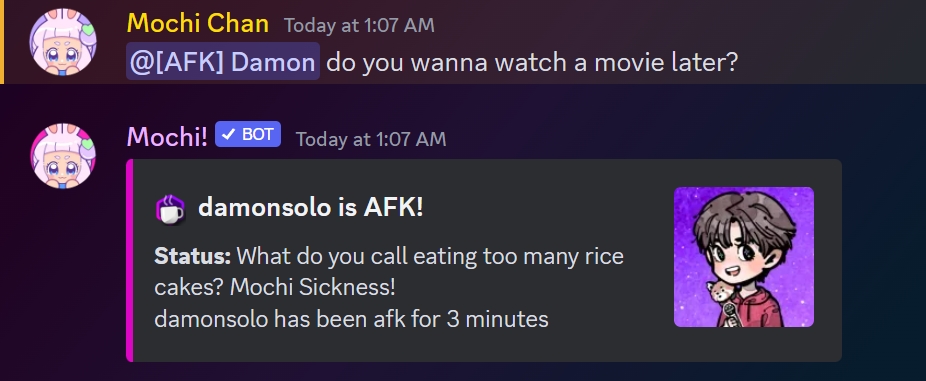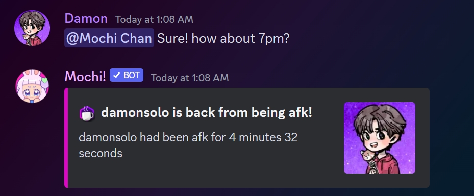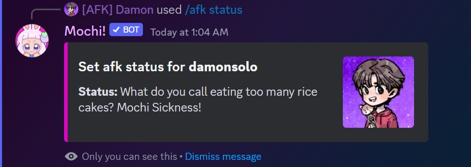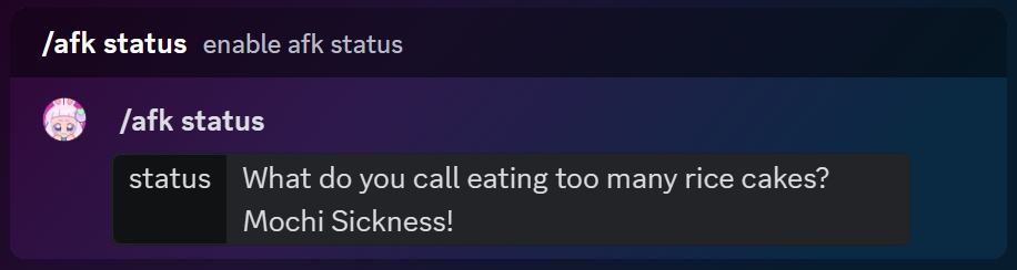 Once you've set your status, you'll get a confirmation message. And don't worry about anyone wondering where you are - your nickname will be temporarily changed to @[AFK] Member