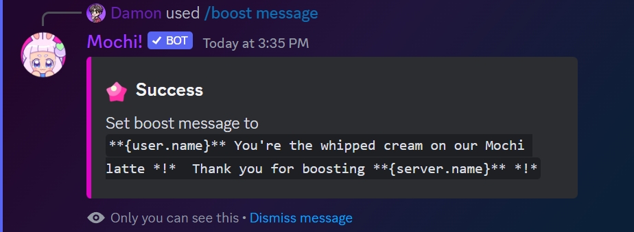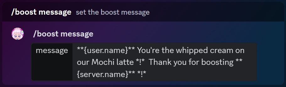 If you want to create a boost message in the server, all you have to do is use the /boost message command. It's super easy! Just type in your message and you're good to go. Plus, you can customize your response by using Mochi variables. How cool is that?