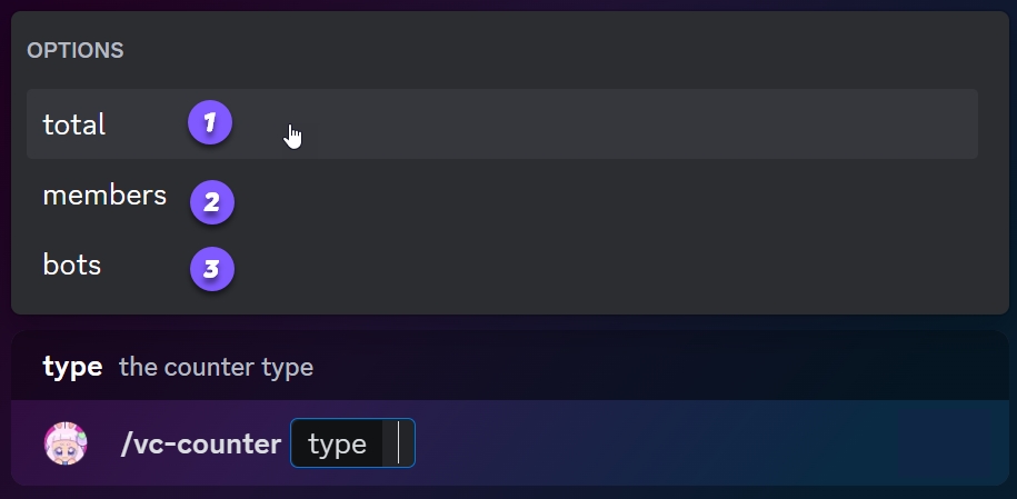 Just select the type of voice channel counter you want from the autocomplete field. This will help you choose the right counter for your needs.