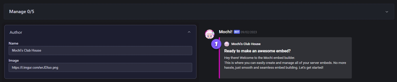 If you want to change the author of your embed, simply click on the dropdown and type in the new name. For our example, we'll go with "Mochi's Club House" as the author. If you like, you can also add an author image to this section.