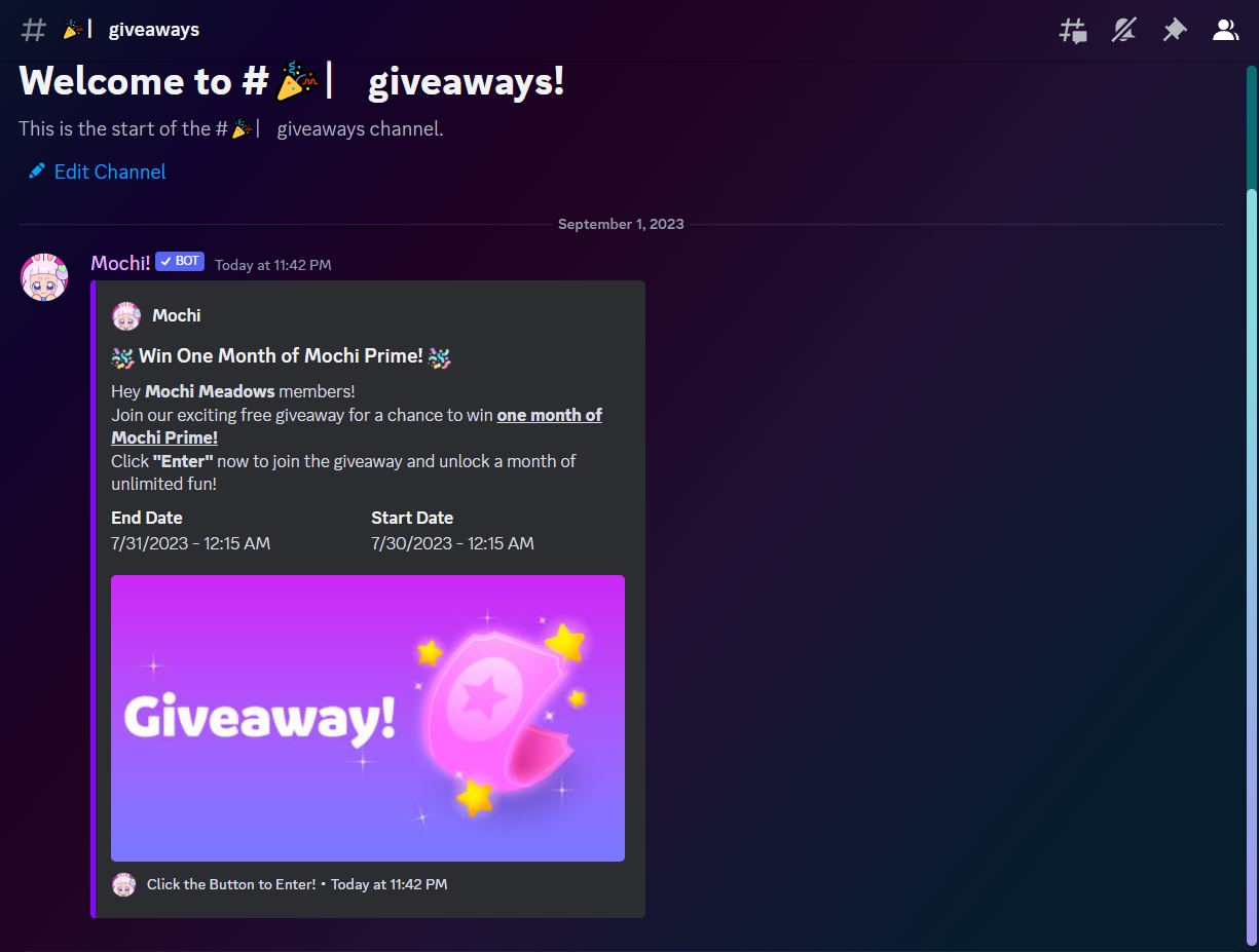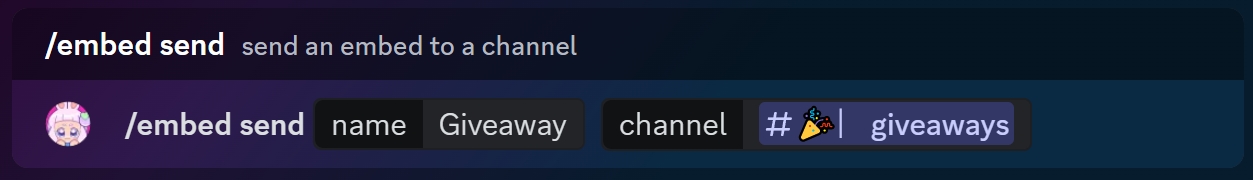 For instance, let's say you want to send a personalized giveaway embed to the giveaways channel (just to show you how it's done!)