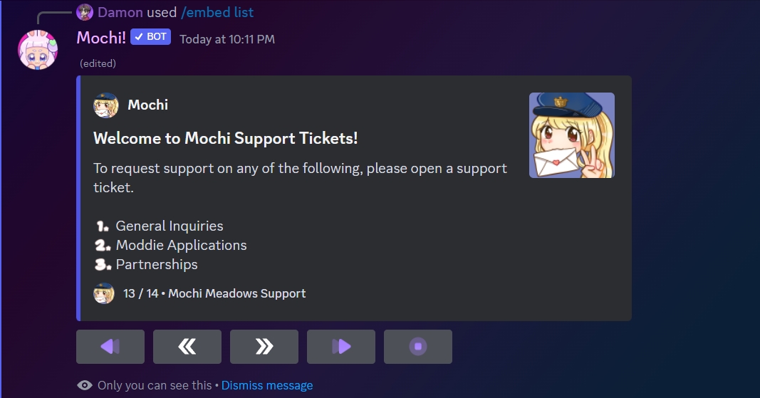 This command gives you a preview and makes it easy to navigate through all the existing embeds in your server.