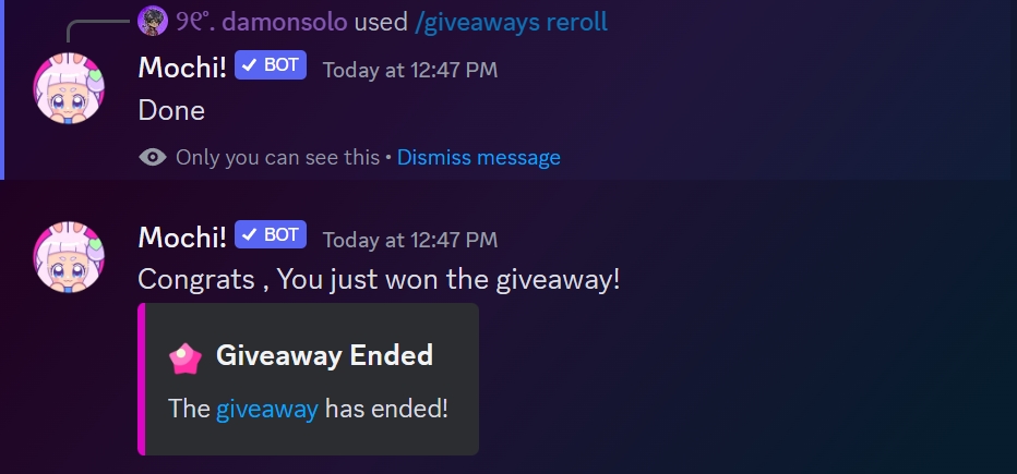 You'll get a confirmation as soon as the giveaway has been rerolled and a new winner will be announced.