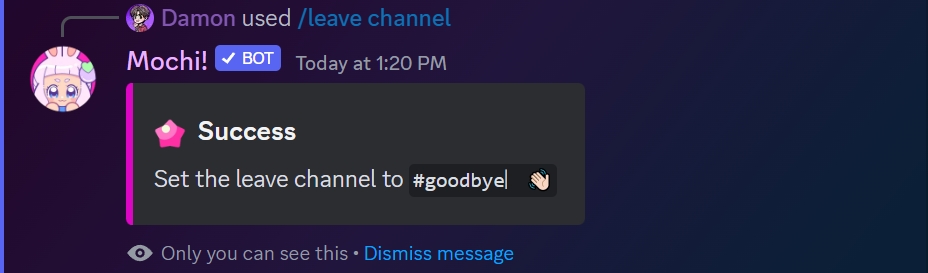 Once the leave channel has been set, you should receive a confirmation: