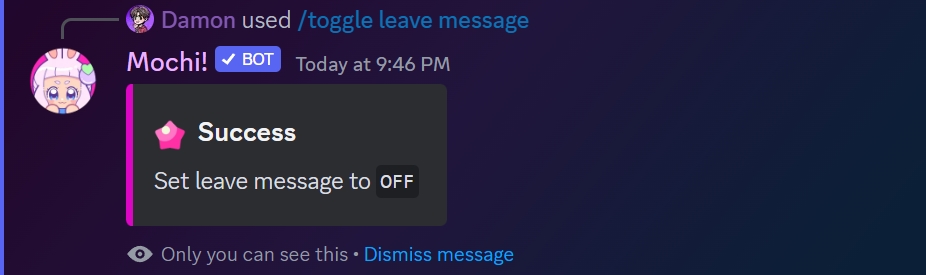 If you want to have the leave message back, it's super easy! Just type /toggle leave message one more time and it will be turned back "ON" in no time.