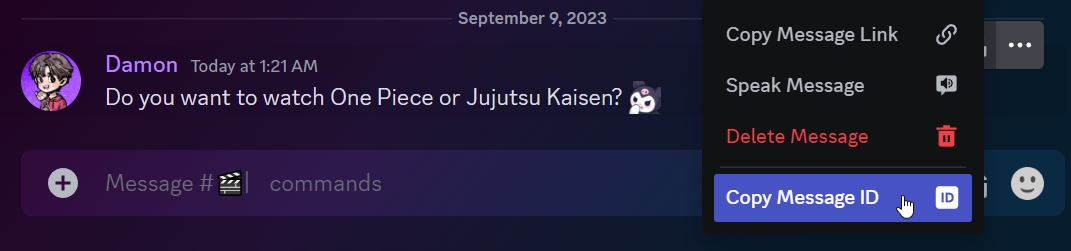 First, select the message you want to turn into a poll. Next, copy its message ID.